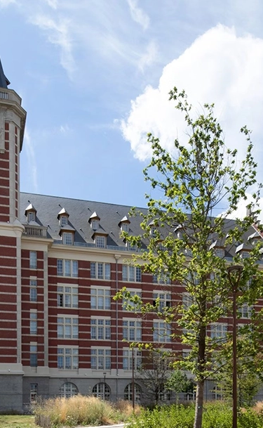 Les Grands Moulins conservent leur architecture néo-flamande emblématique, avec ses façades en brique et ses toitures en ardoise. La réhabilitation respecte l’authenticité des volumes tout en intégrant des aménagements contemporains. La résidence s’organise autour d’une cour intérieure paysagée, pensée comme un espace de convivialité. Le site est sécurisé, fermé au public le soir, et propose des parkings dédiés ainsi qu’un service de gardiennage.