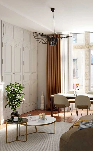 Les appartements se déclinent du studio au 3 pièces et proposent des volumes bien agencés, adaptés aux modes de vie actuels. Les espaces bénéficient d’une belle luminosité grâce aux grandes ouvertures. Les matériaux sélectionnés mettent en valeur le cachet de l’existant, avec la conservation d’éléments à caractère patrimonial lorsque cela est possible. L’ensemble offre un cadre de vie confortable dans un environnement historique unique.