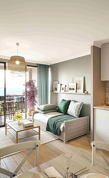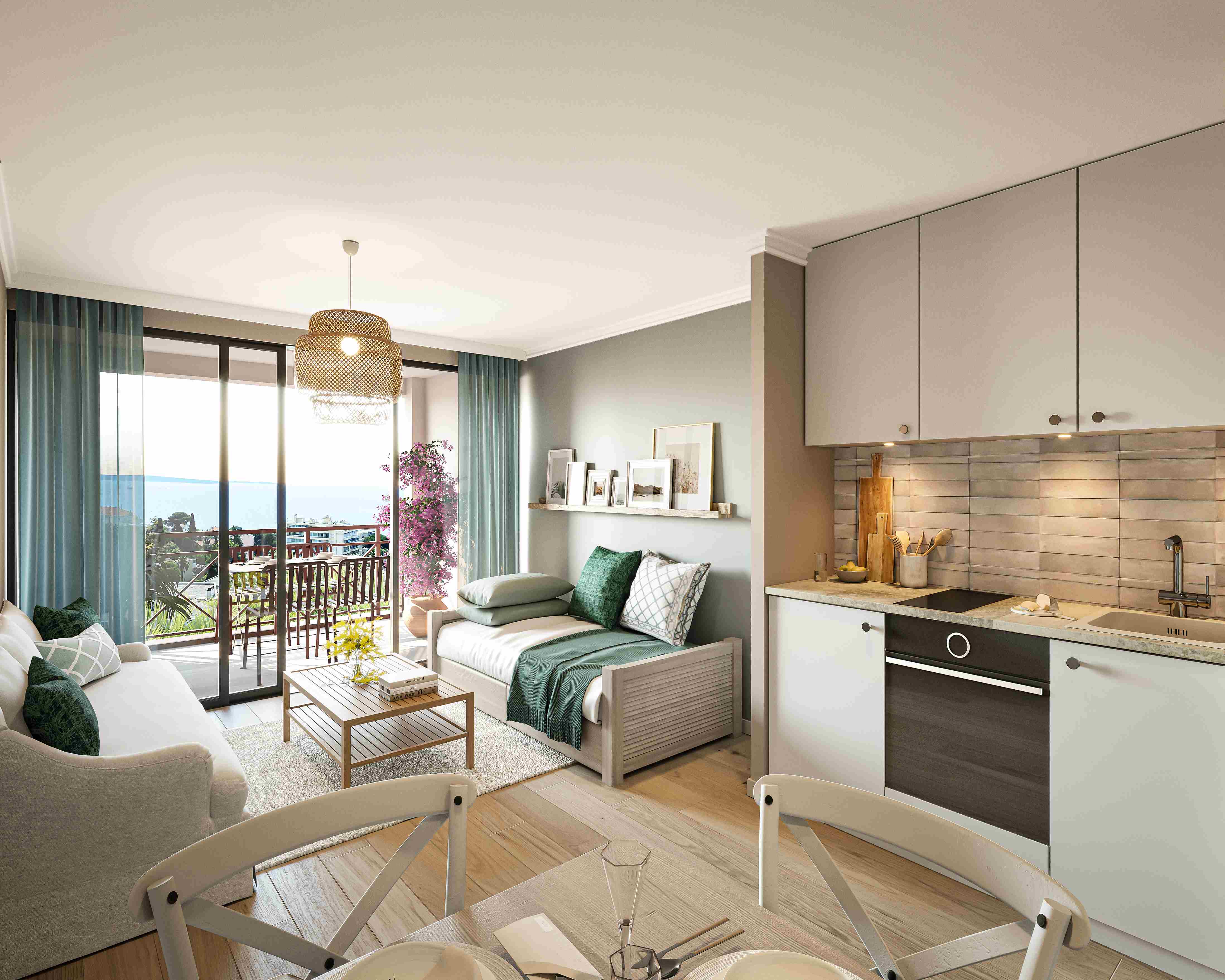 Nous avons imaginé un projet d’architecture intérieure inspiré de l’identité du lieu et de son environnement, en créant une continuité entre intérieur et extérieur, en intégrant la végétation et en évoquant les couleurs de la mer. Chaque logement a été pensé dans son ensemble pour harmoniser matériaux, finitions et mobilier : tons clairs, bois blanchi, faïences blanches et grises, cuisines lumineuses, associés à la paille de Vienne, des touches azur et des tissus à motifs bleus. Enfin, l’agencement des espaces a été étudié pour garantir fonctionnalité, optimisation et modularité, afin d’offrir un habitat à la fois esthétique et confortable.