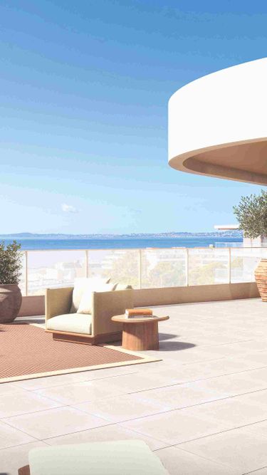 Avec ses courbes raffinées et ses ondulations inspirées par le mouvement de la mer, la résidence dessine une silhouette architecturale unique sur le littoral. Le hall d’entrée, marqué par un « V » monumental, accueille résidents et visiteurs dans une atmosphère exclusive. La majesté du projet s’exprime par un dialogue subtil entre lignes et matériaux : un soubassement en travertin, socle minéral noble, dialogue avec des étages supérieurs aux lignes aériennes animées de balcons filants. Avec leurs délicats garde-corps en verre, les balcons offrent des vues dégagées vers la Méditerranée*. À l’arrière de la résidence, se déploie un jardin méditerranéen où oliviers, lavandes et pins composent un décor d’exception, rare à quelques pas de la mer. Traversé par une sente piétonne, il mène à une piscine élégante qui prolonge une expérience de vie résolument méditerranéenne, entre bien-être et partage.
